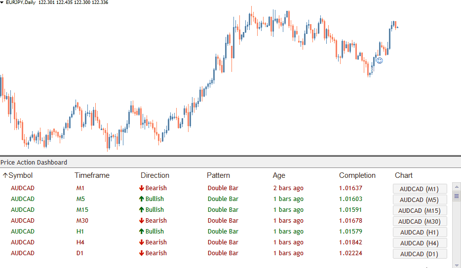 The indicator also displays a beautiful dashboard on your chart where you can see exactly what price action pattern has recently formed on EVERY pair, EVERY time frame.