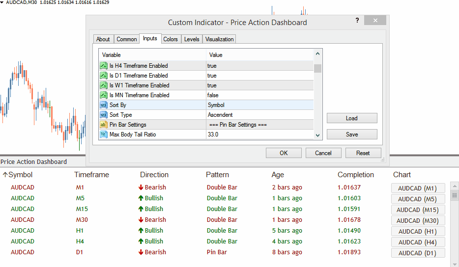 And you’re in total control. You can specify which currency pairs and which time frame you want the indicator to scan for Price Action patterns.