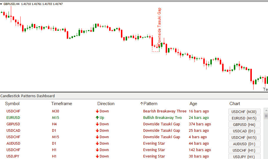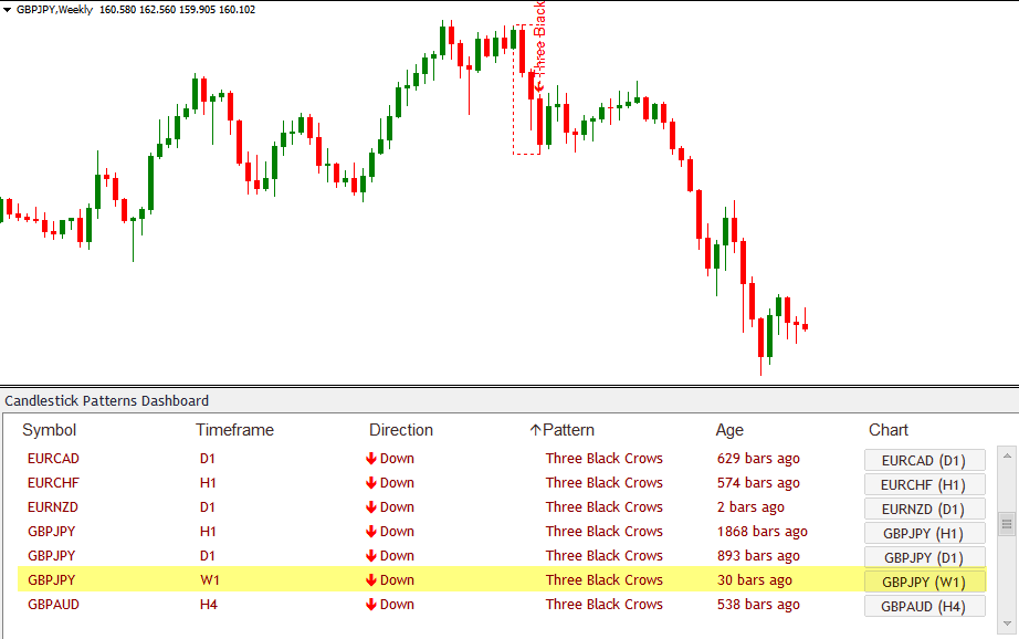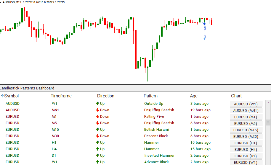 Remember, you can specify as many pairs as you like. You can also use it for indices, stocks, futures, and gold (anything your broker offers in Metatrader). Our Candlestick Dashboard will take care of it all.